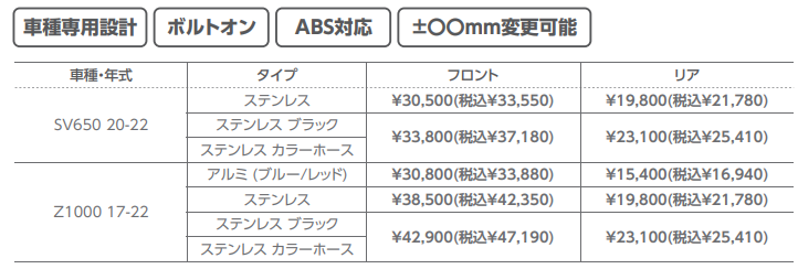 株式会社アクティブは、SV650/X用フロント/リアキャリパーサポート、車種別ブレーキホースキットを発売する。制動力・コントロール性を向上。高強度素材を軽量に仕上げるために肉抜き加工を施し、車体やキャリパーになじむシンプルな形状でデザイン性も両立している。フロントキャリパーサポートが14,080円、リアキャリパーサポートが22,000円(いずれも税込)だ。ブレーキホースキットは、ブレーキタッチがダイレクトに伝わるようになり、スピードコントロールがしやすくなるため制動距離を短くすることが可能だ。