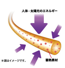 蓄熱粉末素材は、人体と環境からのエネルギーを吸収し発生した熱を蓄え、保温効果を高めます。