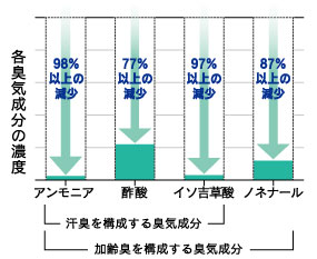 汗のニオイの原因とよばれる 「アンモニア」 「酢酸」 「イソ吉草酸」 だけでなく、加齢臭の原因といわれている 「ノネナール」にも効果があります。