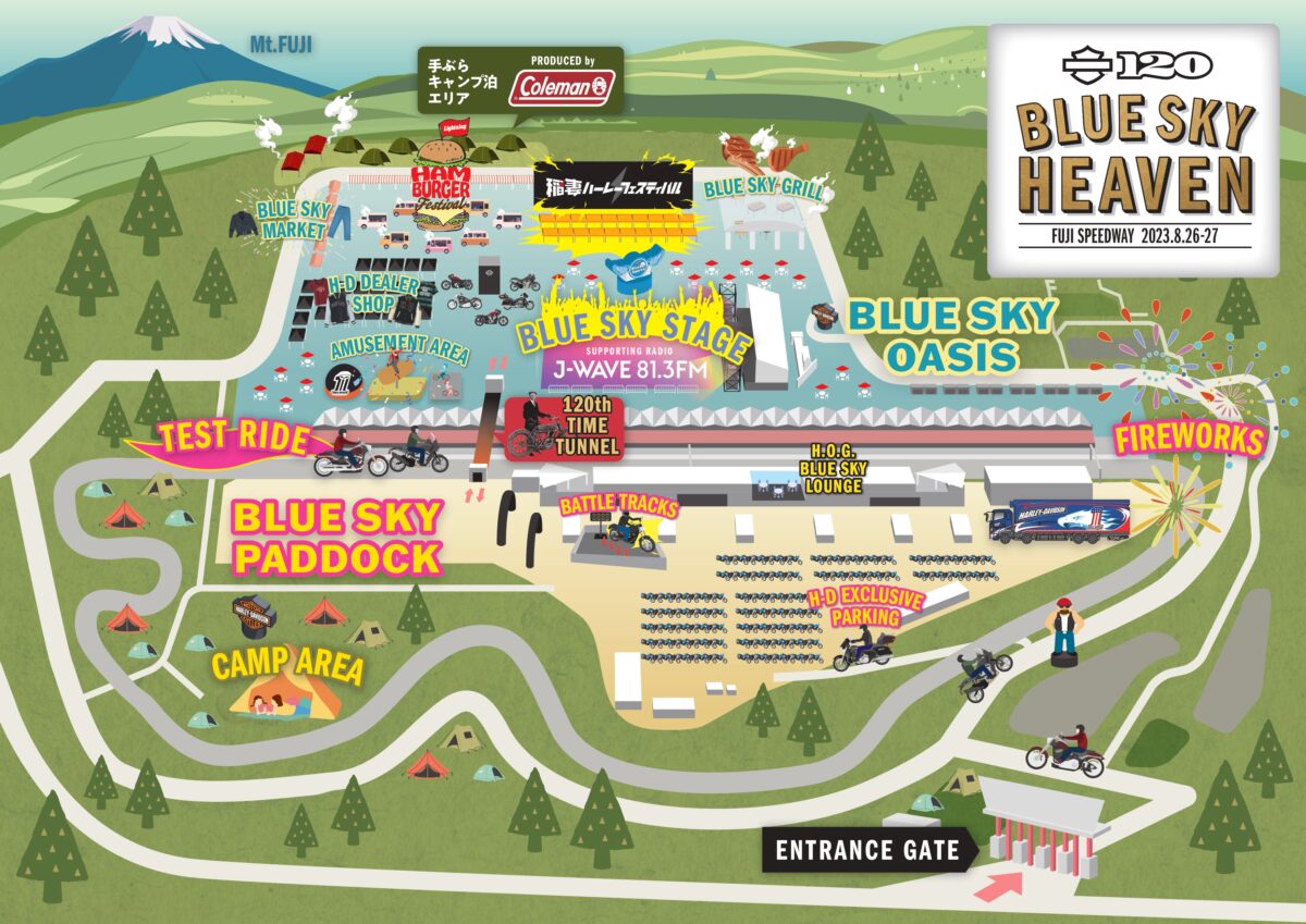 LIVE ステージやショッピング、グルメエリアが集結する『BLUE SKY OASIS』と、サーキット試乗会やバトルトラックスなどバイクプログラムが多数行われる『BLUE SKY PADDOCK』の2つのエリアを中心に、ライダーもキャンパーもご家族連れも、どなたでも楽しめる「ブルースカイヘブン 2023」の詳細は、公式ウェブサイト(https://blueskyheaven.jp/)にてお確かめください。