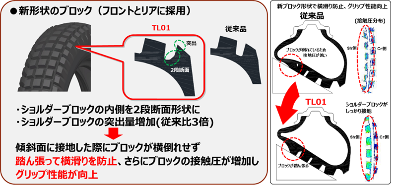 ショルダーブロックの内側を2段断面形状にするとともに、ショルダーブロックの突出量を増加。傾斜面に接地した際にブロックが横倒れせず踏ん張って横滑りを防止し、さらにブロックの接触圧が増加することでグリップ性能を向上しました。