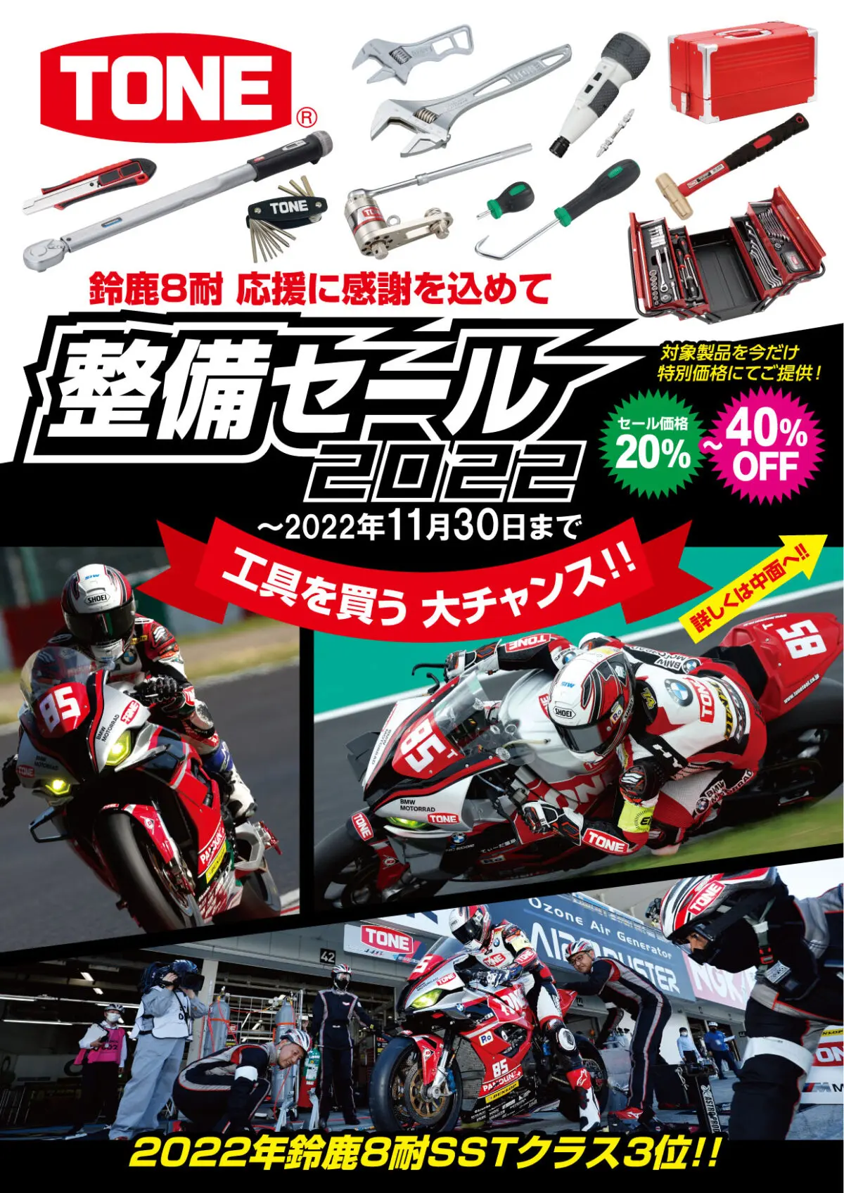 TONE株式会社は、FIM世界耐久選手権 “コカ·コーラ” 鈴鹿8時間耐久ロードレースSSTクラス3位入賞の応援に感謝を込めて、2022年9月1日〜2022年11月30日まで「整備セール2022」を開催する。対象商品は20%〜40%オフとなっており、欲しかった工具を手に入れる大チャンス。詳細は下記をチェックだ。