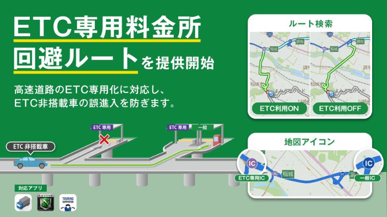~ETC専用化に対応し、陸送業などのETC非搭載車の誤進入を防止。地図上のアイコンでも確認可能!~