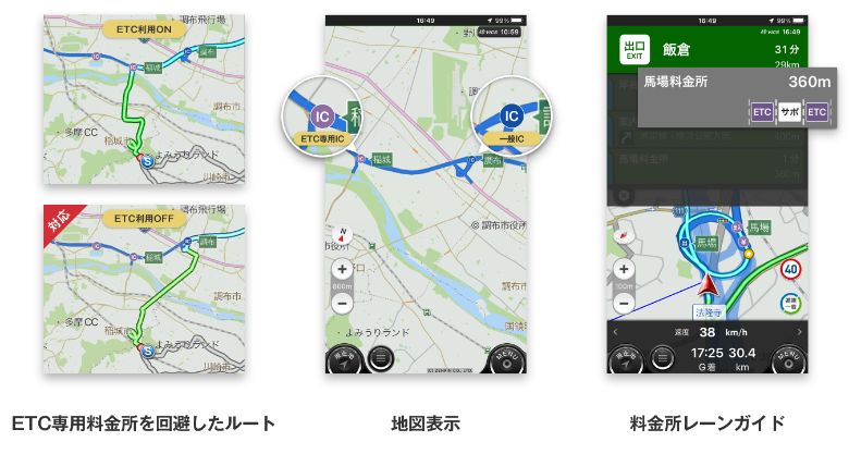 これにより、地図上に表示されるIC(インターチェンジ)のアイコンカラーが、ETC専用かどうかを判別できるようになり、ETC専用料金所への誤侵入を予防する。