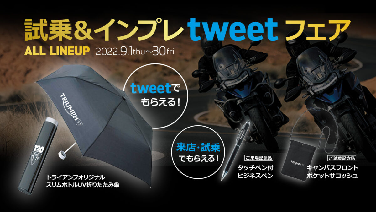 トライアンフモーターサイクルズジャパン株式会社は、9 月 1 日(木)から 9 月 30 日(金)まで、全国のトライアンフ正規販売店にて「ALL LINEUP 試乗& インプレ tweet フェア」を開催する。期間中にトライアンフ正規販売店に来場すると「タッチペン付きビジネスペン」が、試乗をすると「キャンバス フロントポケットサコッシュ」がプレゼントされる。また、試乗した感想をtweetした方限定で、さらに「スリ ムボトル UV 折りたたみ傘」がもらえる(数に限り有り)。気になっていたユーザーはこの機会に来場、試乗してみることをおすすめする。