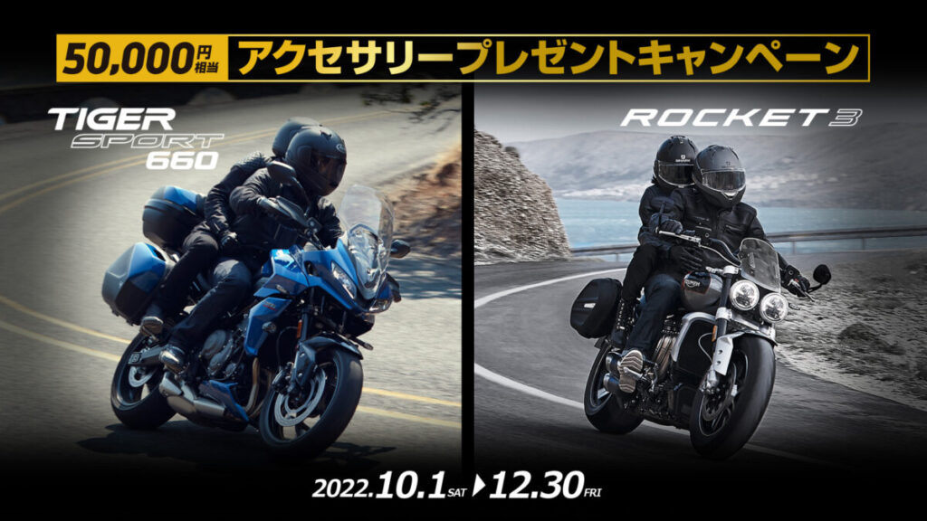 期間:2022 年 10 月 1 日~12 月 30 日まで 内容:キャンペーン期間中、全国のトライアンフ正規販売店にて対象車両をご成約、且つご登録されたお客様に「5 万円分のアクセサリーをプレゼント」いたします。