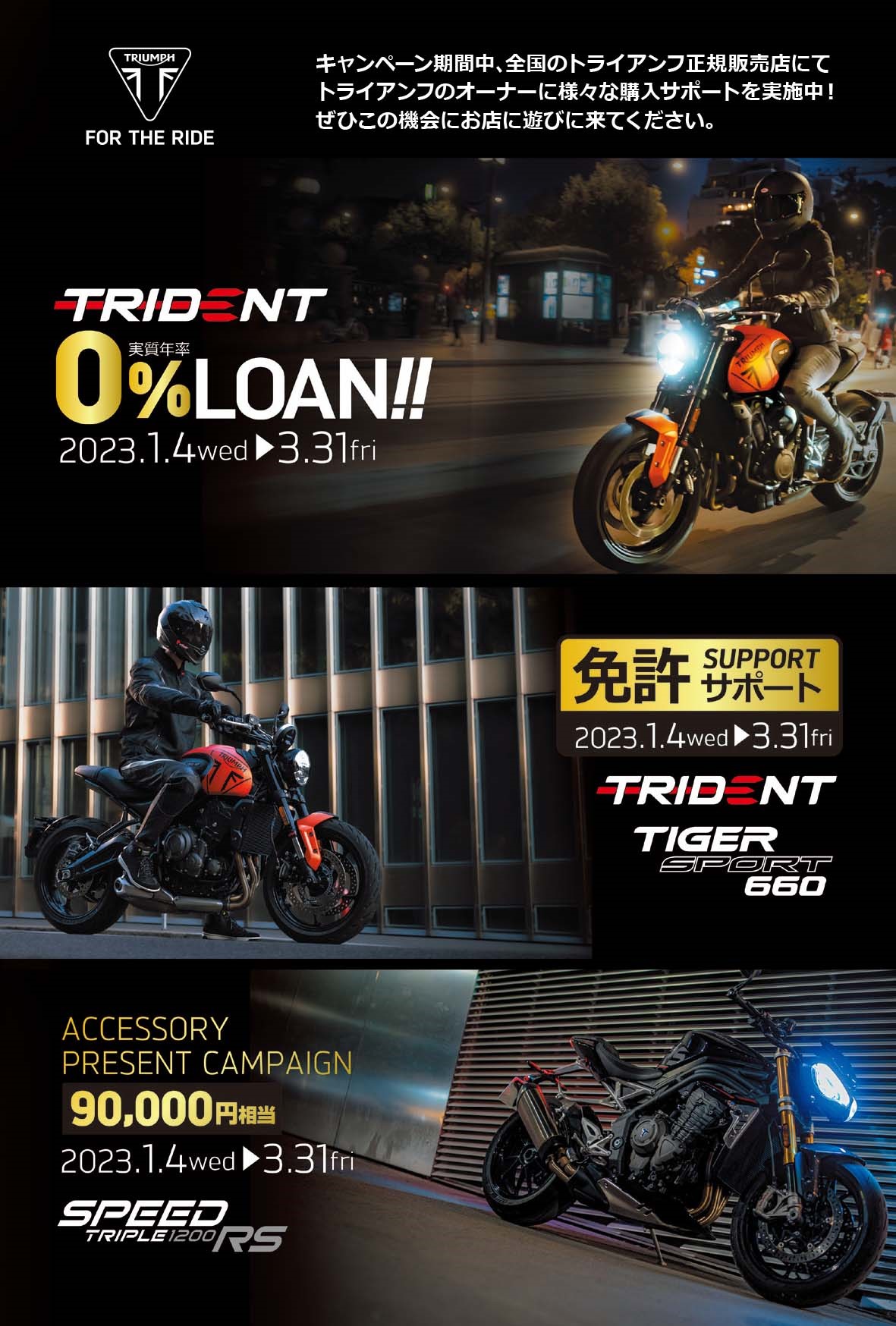 内容:キャンペーン期間中、全国のトライアンフ正規販売店にて対象車両をご成約、且つローン契約を完了していただいたお客様に、「0% ローン」をご提供いたします。