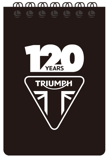 期間中にトライアンフ正規販売店にお越しいただいたお客様にはご来場記念品として、120 周年の今年しか手に入 れることが出来ない「トライアンフ オリジナル A7 メモ帳」、さらに店舗にてご試乗された方にはご試乗記念品として「ト ライアンフ オリジナルアイスタオル」をプレゼントいたします。 ※お一人様一点限り、数に限りがございます。