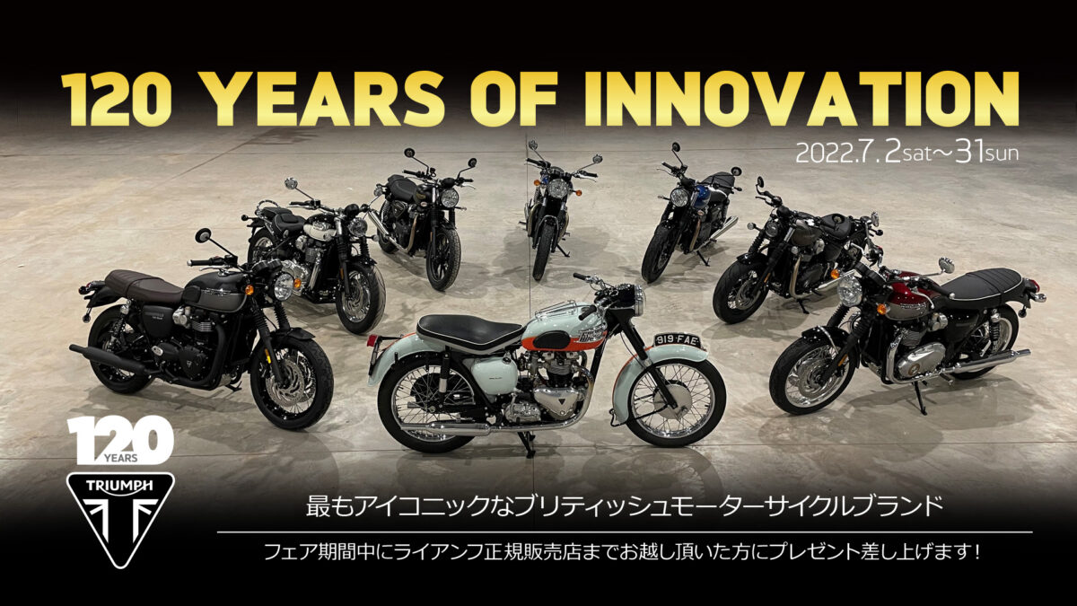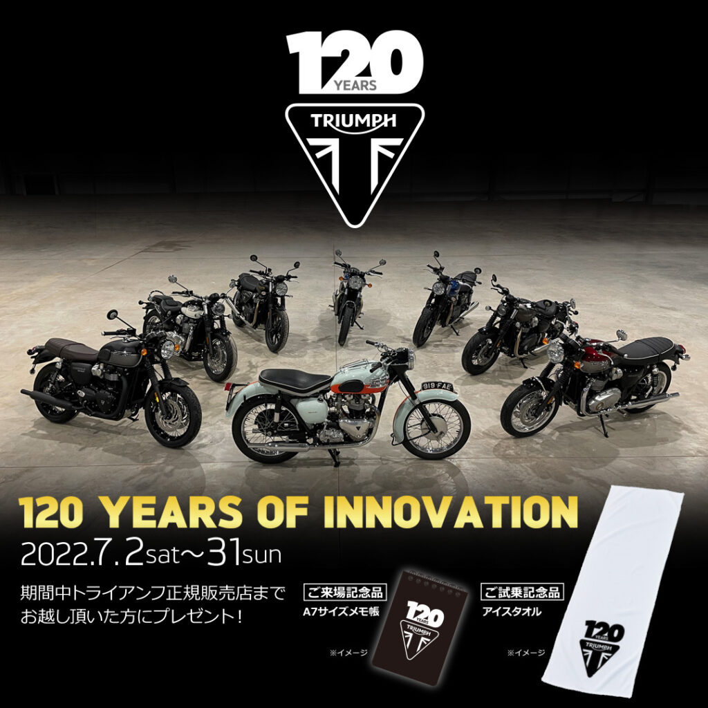 トライアンフモーターサイクルズジャパン株式会社(本社:東京都港区海岸 代表取締役社長:大貫陽介)は、7 月 2 日(土)から 7 月 31 日(日)までの期間中、全国のトライアンフ正規販売店にて「120 Years Anniversary Fair(120 周年フェア)」を開催することをお伝えいたします。
