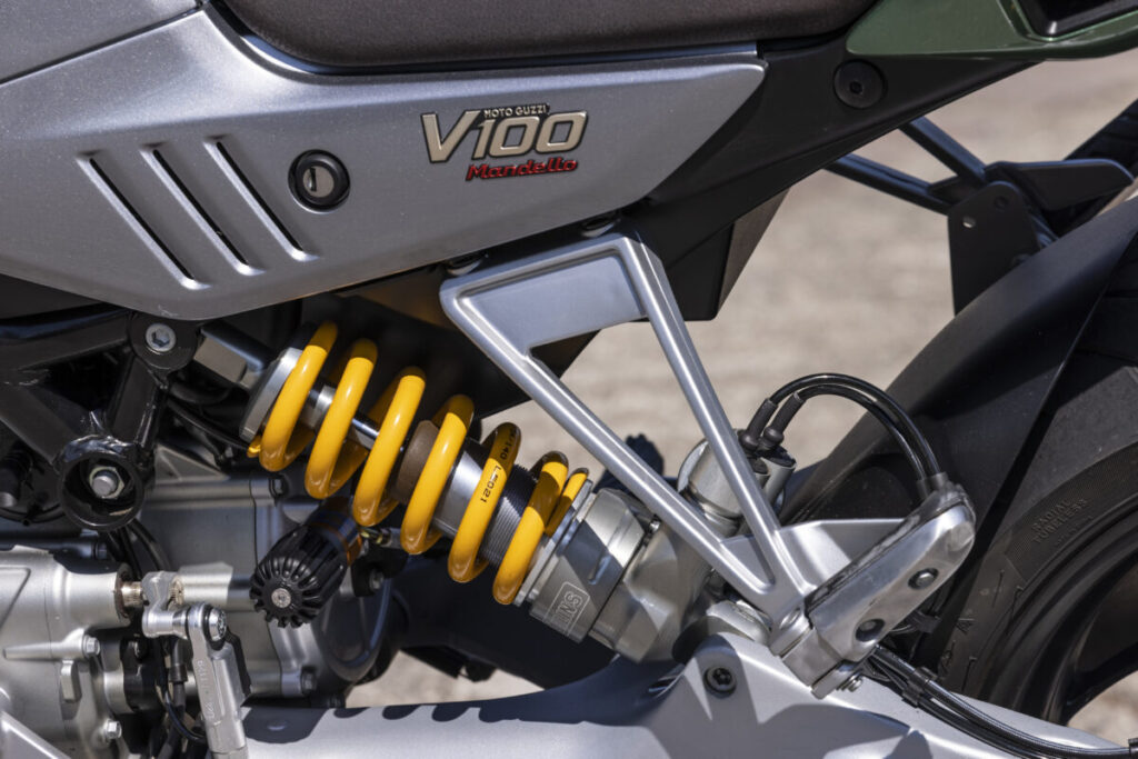 また、サスペンションとブレーキは、スポーツライディングの楽しさとコントロール性、長距離走行時の安全性と快適性を保証しています。モト・グッツィ V100 マンデッロには、リバウンドとスプリングプリロードが調整可能なKYB 製φ41mm フロントフォークを採用。リアショックも同メーカーのもので、マニュアル操作でリバウンドとスプリングプリロードを調整することができます。路面の凹凸を吸収するために、傾斜をつけたポジショニングを研究、改良し、プログレッシブな介入と感度を提供しています。モト・グッツィ V100 マンデッロ“S”バージョンには、最新のオーリンズ製スマート EC2.0 セミアクティブ・サスペンション・システムを採用し、アスファルトの状態を読み取り、それに応じて刻々とバイクの設定を調整します。オーリンズ製スマート EC 2.0 サスペンションを制御する ECU は、バイクのすべての電子制御システムにアクセスでき、つまりオーリンズ社とモト・グッツィが共同開発したアルゴリズムによって、すべてのライディングフェーズを認識し、フロントフォーク、リアショックアブソーバー、ステアリングダンパーの油圧の設定を行うことが可能となります。このシステムは、サスペンションの油圧の設定を刻々と効率的に調整し、あらゆるコンディションにおいて最適な設定を実現します。また、路面の凹凸を認識する機能が強化され、快適性と走る楽しみを向上させています。