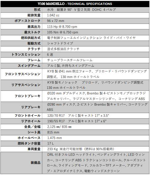 V100 Mandello S / V100 Mandello 主要諸元
