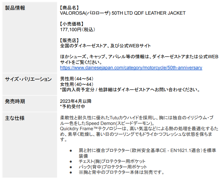 株式会社ユーロギアは、イタリア発プロテクティブギアブランドダイネーゼ社の50周年を記念して限定生産される「50th Anniversario(アニベルサリオ)」カプセルコレクションの発売を開始した。素材には柔軟性と耐久性に優れたTutuカウハイドレザーを採用し、素早く乾燥することで高い気温などによる熱の処理を最適化し、暑い日のツーリングでもドライかつフレッシュな状態を保つQuickdry Frame™テクノロジーを搭載。肩と肘には複合プロテクター(欧州安全基準CE – EN1621.1適合)を標準装備し、 チェスト(胸)とバック(背中)には別売りのプロテクターを装着できるポケット付となっている。レザージャケットのほか、シューズやキャップ、アパレルも販売される。価格は177,100円(税込)、全国のダイネーゼストア、及び公式WEBサイトにて購入が可能だ。