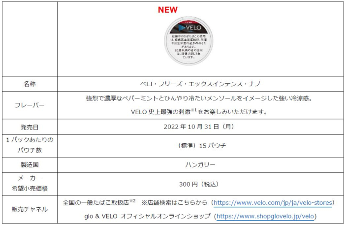 ブリティッシュ・アメリカン・タバコ・ジャパン(本社:東京都港区赤坂、社長:ジェームズ 山中、以下「BATジャパン」)は、歯茎と頬の間に挟んで楽しむ純白パウチのオーラルたばこ「VELO(ベロ)」ブランドから、VELO史上最強の刺激(※1)を楽しめるフレーバー「ベロ・フリーズ・エックスインテンス・ナノ」を本年10月31日(月)より全国の一般たばこ取扱店(※3)及びglo & VELO オフィシャルオンラインショップで販売を開始します。