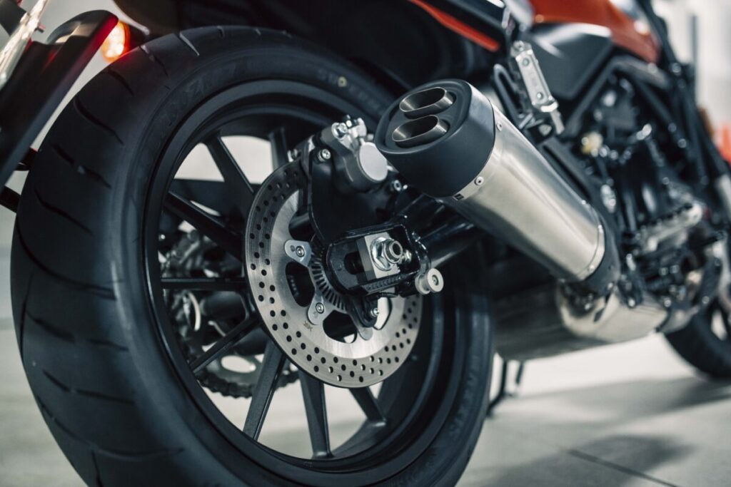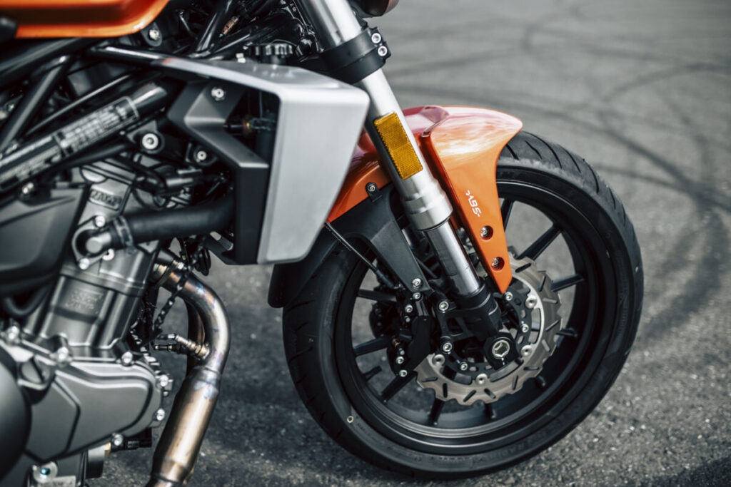 強い中速トルクを発生するようチューニングされた 6 速トランスミッションの 353cc DOHC 4 バルブ水冷パラレルツインエンジンを搭載し、湿板クラッチはケーブル式、ファイナルドライブはチェーン式です。軽快な走りを実現する前後 17 インチ(432mm)ホイールを装備し、フロント 120/70 ZR17、リア 160/60 ZR17 サイズの Maxxis Supermaxx ST タイヤとなります。フロント・デュアルディスクブレーキとリア・シングルディスクブレーキには、アンチロック・ブレーキ・システム(ABS)も標準装備しています。