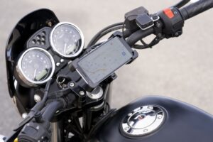 スマホの取付方法は実に簡単。ホルダーの台座左右にあるレバーを押し込むとX型の大きなアームが拡がる。そこで台座中央にある丸いスイッチの上にスマホを置けば、X型のアームが締まり、がっちりスマホをつかんでくれる仕組み。造りがかなりしっかりしているので、自転車やバイクで道路を走行していても、簡単にスマホが外れる心配はない。