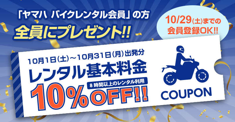 ※ クーポンを受け取るにはあらかじめヤマハ バイクレンタルへの会員登録(無料)が必要です。