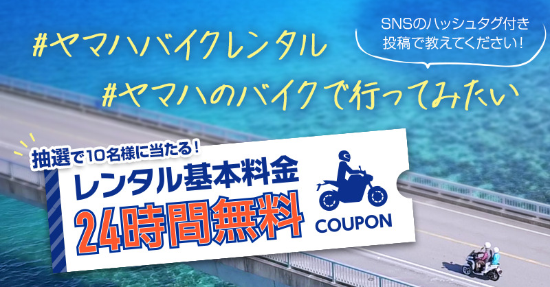 ハッシュタグ「#ヤマハバイクレンタル」と「#ヤマハのバイクで行ってみたい」の2つを付けて投稿された方の中から抽選で10名様に、