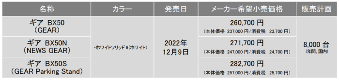 「GEAR」には、標準型の「ギア BX50(GEAR)」、新聞配達用の「ギア BX50N(NEWS GEAR)」、シートに座ったまま簡単な操作でスタンド掛けできる「ギア BX50S(GEAR Parking Stand)」の3機種をラインアップしています。