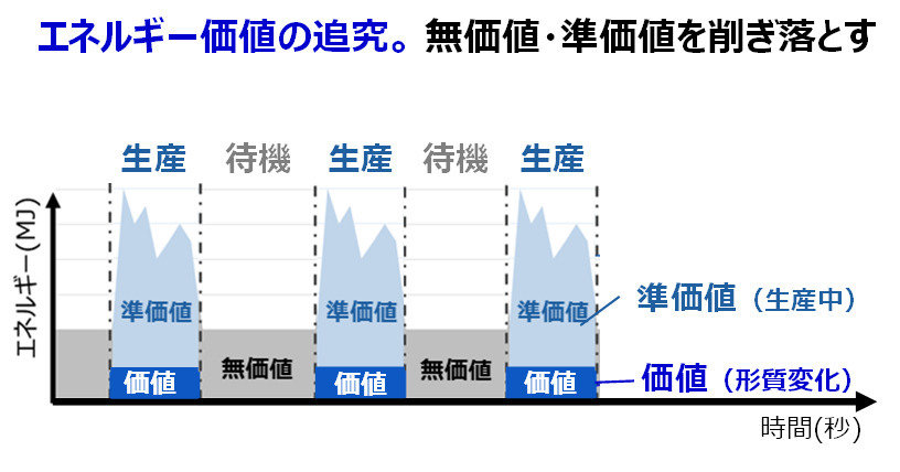 分析においては、「IoT見える化システム」を導入することで、各設備のエネルギー使用量を秒単位で計測。各設備の詳細なエネルギー使用量の変化に加え、設備の稼働周期や設備間のエネルギー使用量の関係性を明らかにし、「理論値エナジー」の考え方に基づきエネルギーの価値を分析しました。