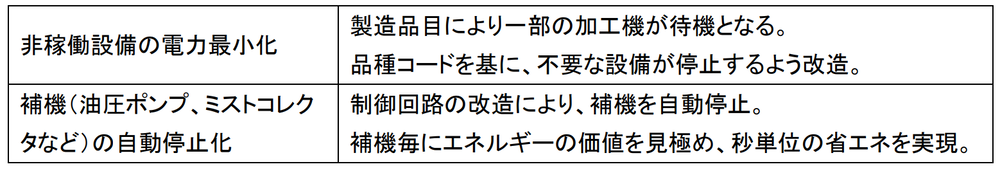 見える化したデータを用いて「理論値エナジー」の考え方に基づきエネルギーの価値を分析。その結果、使用しているエネルギーを「価値」「準価値」「無価値」に分類することが可能となりました。今回は、「無価値」に分類されたエネルギー使用をゼロとし、「準価値」に分類されたエネルギー使用を最少化することを目標に設定。非稼働設備の電力最小化と補機(油圧ポンプ、ミストコレクタなど)の自動停止化を行いました。
