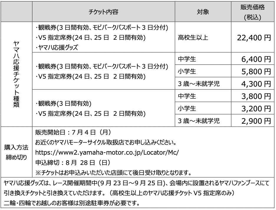 ヤマハ発動機販売株式会社では、ヤマハライダーに熱い声援を送るヤマハ応援席を設け、オリジナルヤマハ応援グッズがセットになった応援チケットを全国のヤマハモーターサイクル取扱店で 7 月 4 日より販売いたします。応援チケットは予定数量に達し次第、販売終了となります。