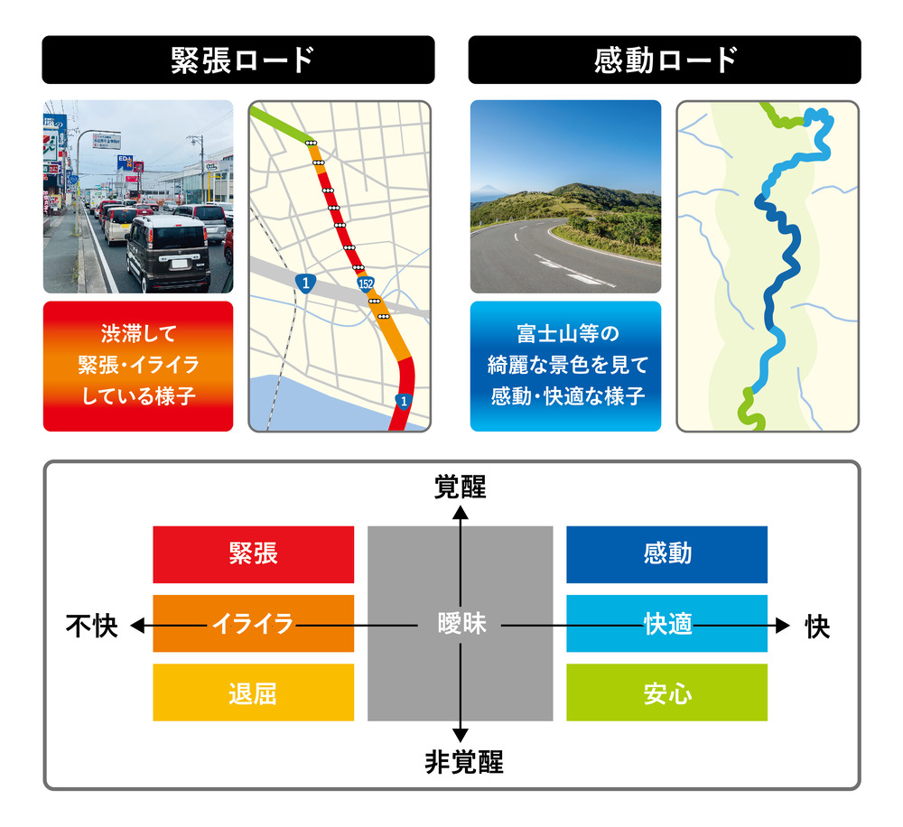 緊張を示す渋滞道路(左)と、感動を示すツーリングロード(右)の表示例