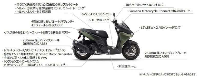 主な特徴は、1)トラクションコントロールシステムを採用した、走りの楽しさと燃費・環境性能を両立する“BLUE CORE”エンジン、2)静粛なエンジン始動をもたらす「Smart Motor Generator」および全域でのハイパワーに貢献する「VVA(可変バルブ)」、3)軽量・高剛性の新フレームとスポーティな走行を支える足回り、4)ストリートモタードを表現した斬新なスタイリング、5)着信通知や燃費管理が可能なスマートフォン専用アプリへの対応などである。