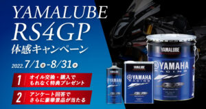 ヤマハ発動機販売とワイズギアは、ヤマハ純正オイル”YAMALUBE(ヤマルー ブ)”シリーズの最高峰エンジンオイル「RS4GP」の体感キャンペーンを 2022 年 7 月 1 日(金)から 8 月 31 日(水)まで実施することを発表した。キャンペーン期間中に、対象店で YAMALUBE RS4GP をご購入・オイル交換いただいた方にもれなく YAMALUBE オリジナルグッズを、さらにWeb アンケートに回答した方に抽選で豪華景品をプレゼントする。