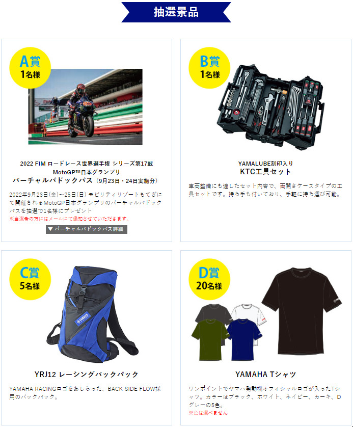 キャンペーン期間中に、対象店で YAMALUBE RS4GP をご購入・オイル交換いただいた方にもれなく YAMALUBE オリジナルグッズを、さらにWeb アンケートに回答くださった方に抽選で豪華景品をプレゼント致します。
