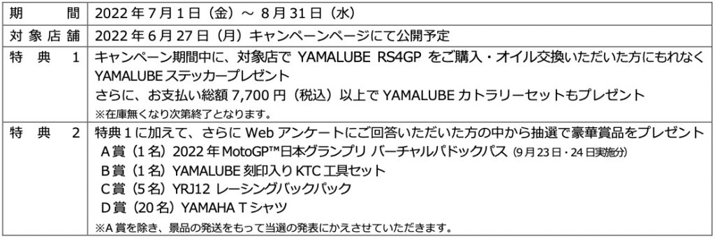 期間中に対象店でオイル交換・購入した方に特典プレゼント YAMALUBE RS4GP 体感キャンペーン開催について