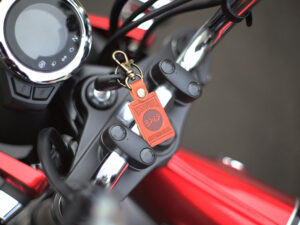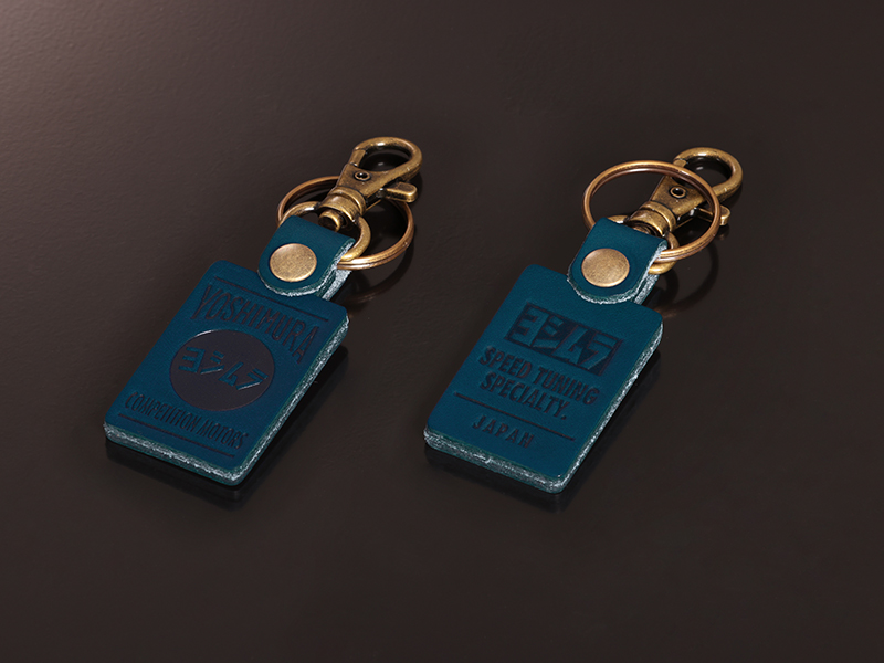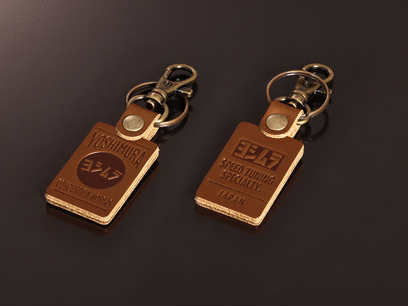 昭和時代のヨシムラロゴをアレンジした、古き良き時代を彷彿させるレトロなデザインのレザーキーホルダー。マシンのグラフィックに合わせ5色からお選びいただけます。