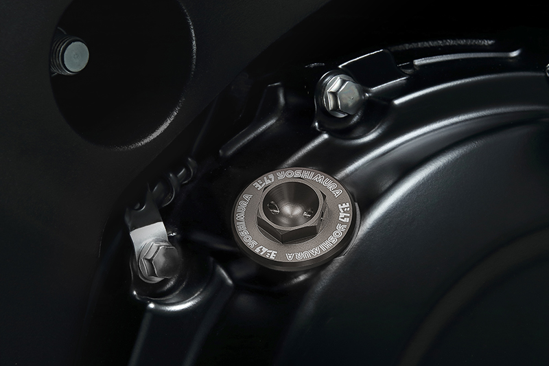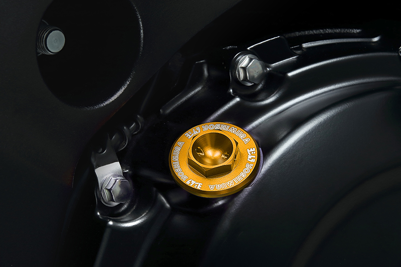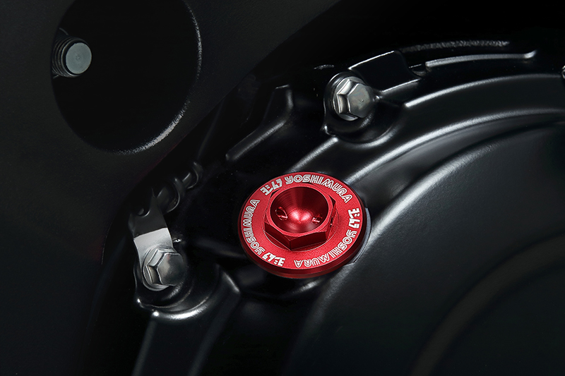 - ヨシムラアルミ削り出しパーツでは定番色の、レッド、ブルー、ゴールドに、新色スレートグレーを追加。美しいアルマイト加工を施したカラーには、レーザーマーキングでヨシムラロゴを刻印しています。