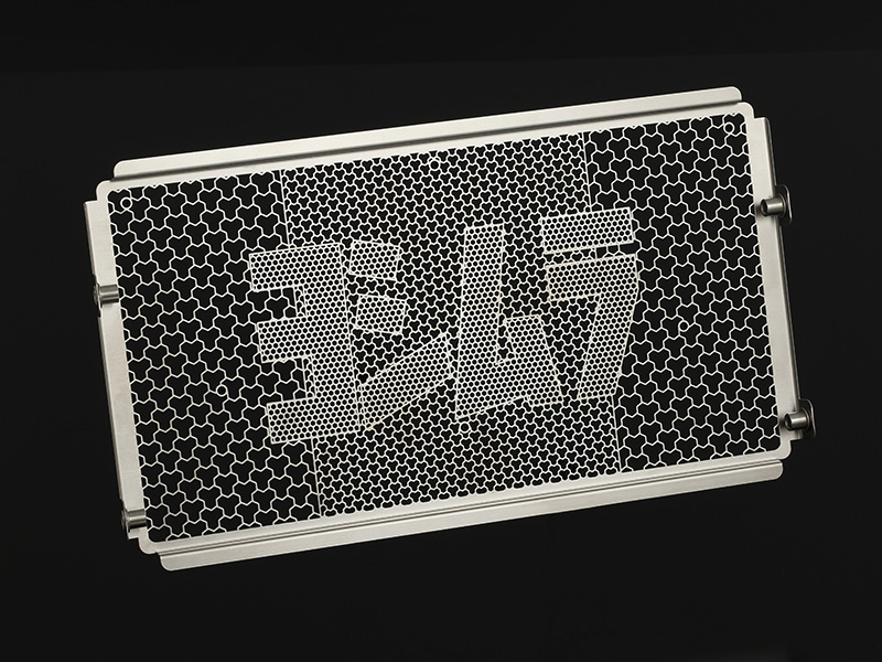 エッチング加工による高精度のhexagonal(ヘキサゴナル=亀甲)メッシュパターンを採用。ヨシムラ独自の「Yライン」を描く美しい網目の中央にはシンプルで主張しすぎない デザインの「ヨシムラ」ロゴを配置。ドレスアップ要素と実用性を備えています。