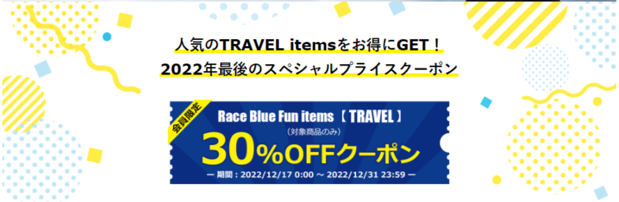 【オンラインショップ限定】Race Blue Fun items <TRAVELアイテム> 30%OFFクーポン プレゼントキャンペーン開催中