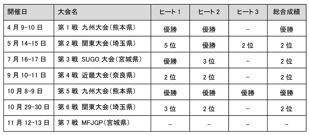続く第3・4戦は全4ヒートで表彰台に立ってリードを広げると、今季2回目となる3ヒート制で行われた第5戦九州大会で3連勝し、ライバルに77ポイントという大差をつけて第6戦に臨みました。