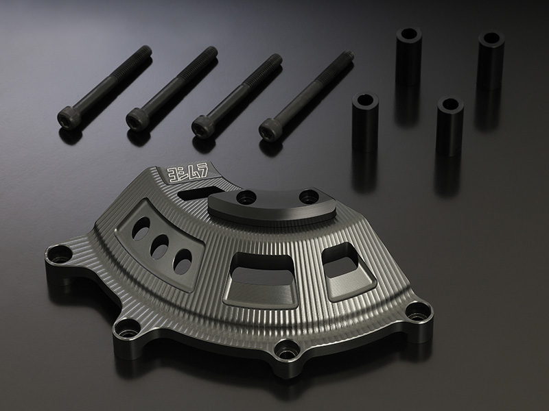エンジン形状に合わせ、強度とデザイン性を考慮し設計。高精度に削り出されたアルミカバーは金属光沢が美しいスレートグレーにアルマイト加工され、エンジンとの一体感を高めています。