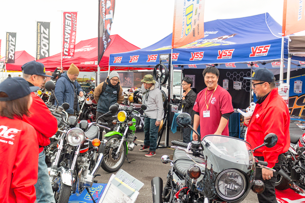 メイン会場内もご覧の通りの賑わい。出展エリアにはZ祭のメインテーマである空冷Zシリーズ以外も、現行Z900RSを始めとした人気車種向けパーツを販売するパーツメーカーやショップも多くテントを連ねた。普段は出入りするバイクショップや量販店の店頭、web上でしか眺めることのできないパーツを直に手にして、そのメーカー/ショップの担当者から詳しく話を聞くことができる機会とあって、どのブースにも黒山の人だかりとなっていた。