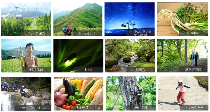 キャンプ場では、ゴンドラ遊覧、トレッキング、ナイトゴンドラ、星空観測、山菜採り、野菜の収穫体験、ホタル観賞、川遊び、遊歩道散策、シャワークライミング、野菜マルシェ、昆虫採集、サマースキー、スノーボードなど都会では味わうことのできない体験でいっぱいです。