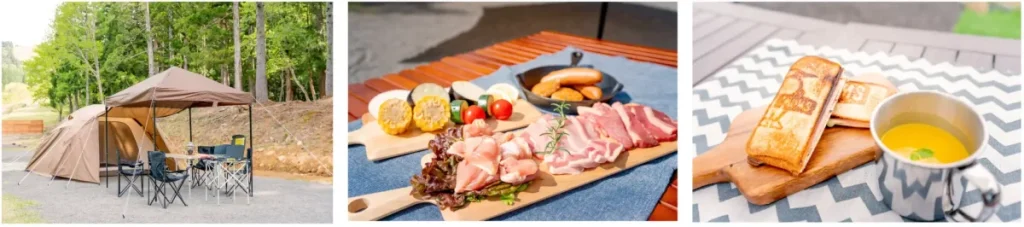 夕食・朝食付の手ぶらプランで何も気にせずキャンプを満喫!テント、タープ、フロアマット、シュラフ(人数分)、テーブル&チェア、ランタン、ハンディライト(人数分)、ガスコンロ(鉄板・ガス)、ホットサンドメーカー、食器類(1名につき1セット)、夕食(スタンダードBBQセット)、朝食(ホットサンド、スープ)付