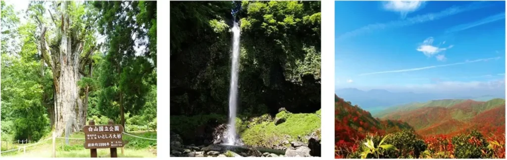 キャンプ場周辺には自然スポットがたくさんあります。清流『石徹白川』をはじめ、大蛇が住むという伝説のある村間ヶ池、推定樹齢は1,800年の特別天然記念物(国指定)の石徹白大杉、白山中居神社の巨木の森、落差60m日本の滝百選の阿弥陀ヶ滝、標高1,709m大日ヶ岳など、全て回るには、1日では足りないほど。