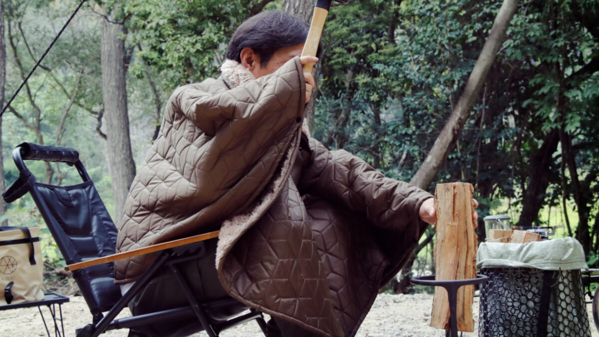 キャンプシーンでの動きやすさと風が入りにくくなるような円形のブランチョ。「極暖」の内生地 ✖ 冷気の侵入を防ぐ無縫製キルティングの外生地で、熱を逃がさない”魔法瓶状態”に!