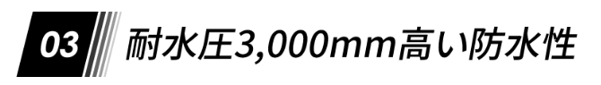 一般的なテントやタープで使われる生地の耐水圧は1,500mm前後が多いところ、本商品の耐水圧は3,000mm。急な雨からもしっかりガードします。