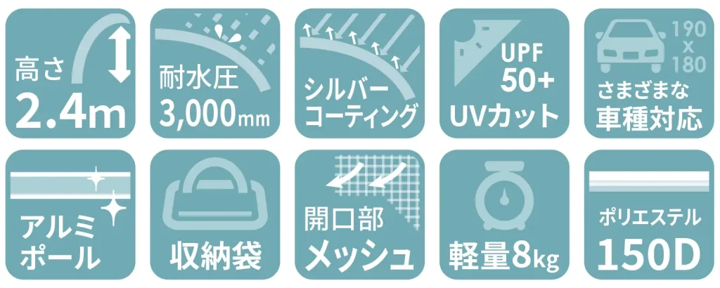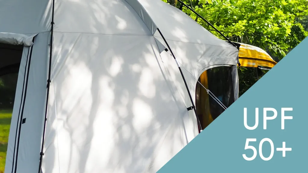 生地には紫外線カット率を高めるシルバーコーティングを採用。夏の強力な紫外線からもしっかりガードします。海沿いや駐車場、開けたオートキャンプ場など、日陰がとりにくい場所でも安心です。
