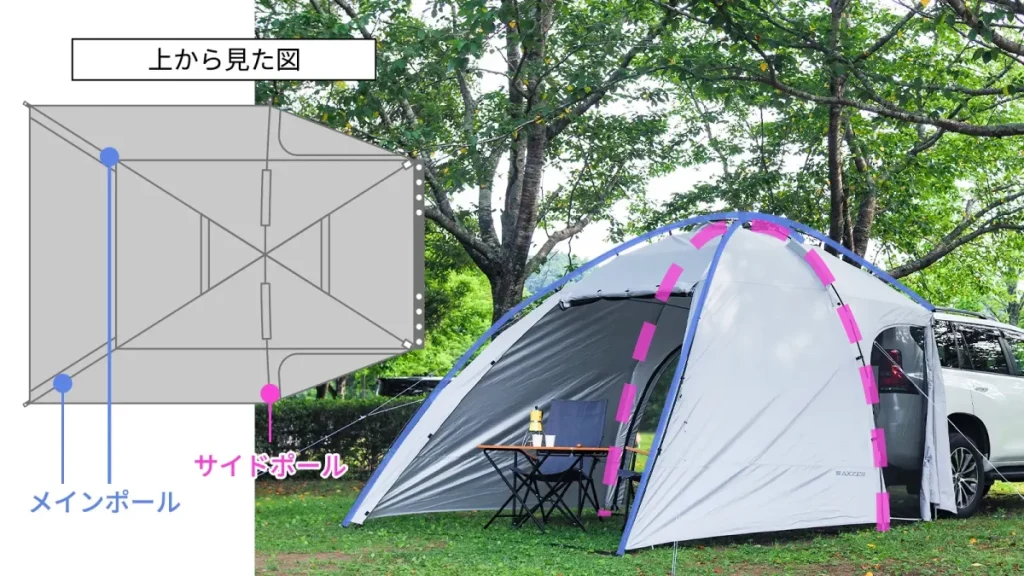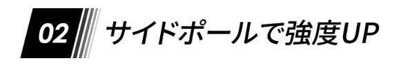 シェルターの屋台骨となるメインポールをサポートするサイドポールを採用。