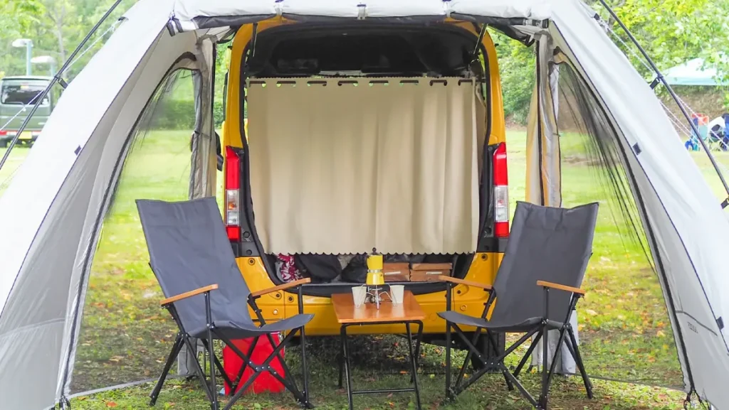 窮屈な車中泊はもう終わり!車(寝室)にリビングを追加するという発想のカーサイドシェルター誕生!