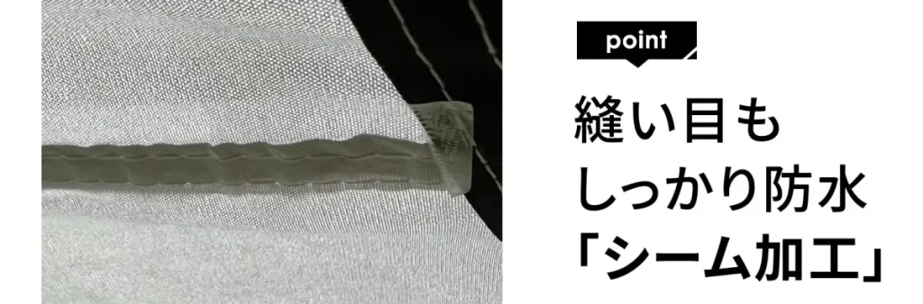 生地の防水性能が優れていても、その生地と生地の縫い目は浸水のリスクがあります。本商品では防水性の「シームテープ」を縫い目の上に貼ることで、さらに防水性を高めました。