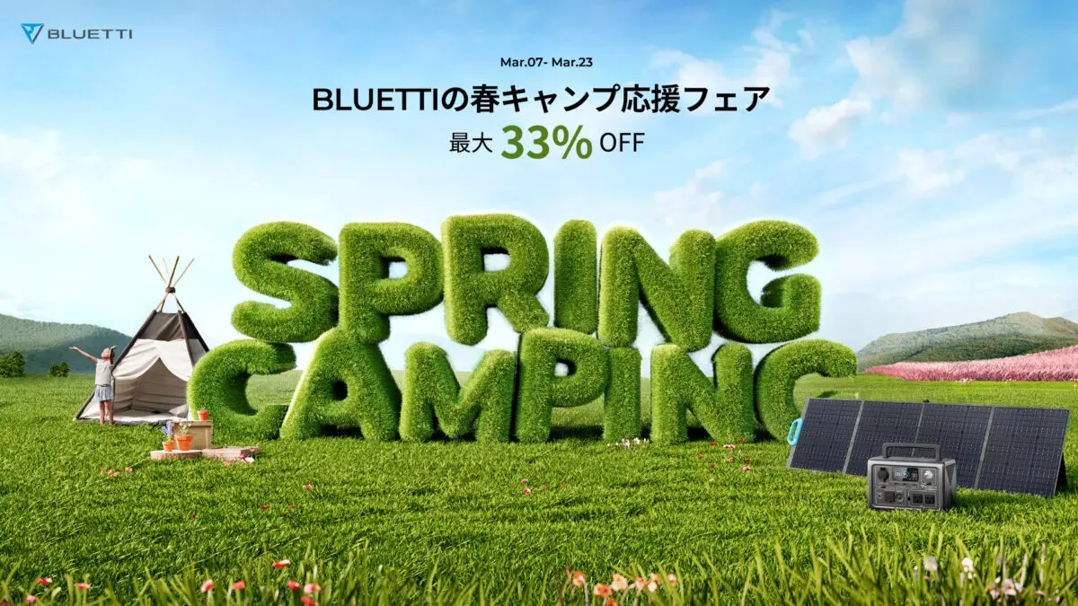 BLUETTI JAPAN株式会社は、春キャンプ応援フェアを2023年3月23日(木)まで実施する。人気製品が最大33%オフで購入可能、1回の購入金額に応じてBLUETTIオリジナル製品をプレゼント、また、 BLUETTIポイント30倍などお得なキャンペーン内容となっている。ソロキャンプからグループキャンプまで使える豊富なラインナップが揃うポBLUETTIで、春キャンプを楽しもう。