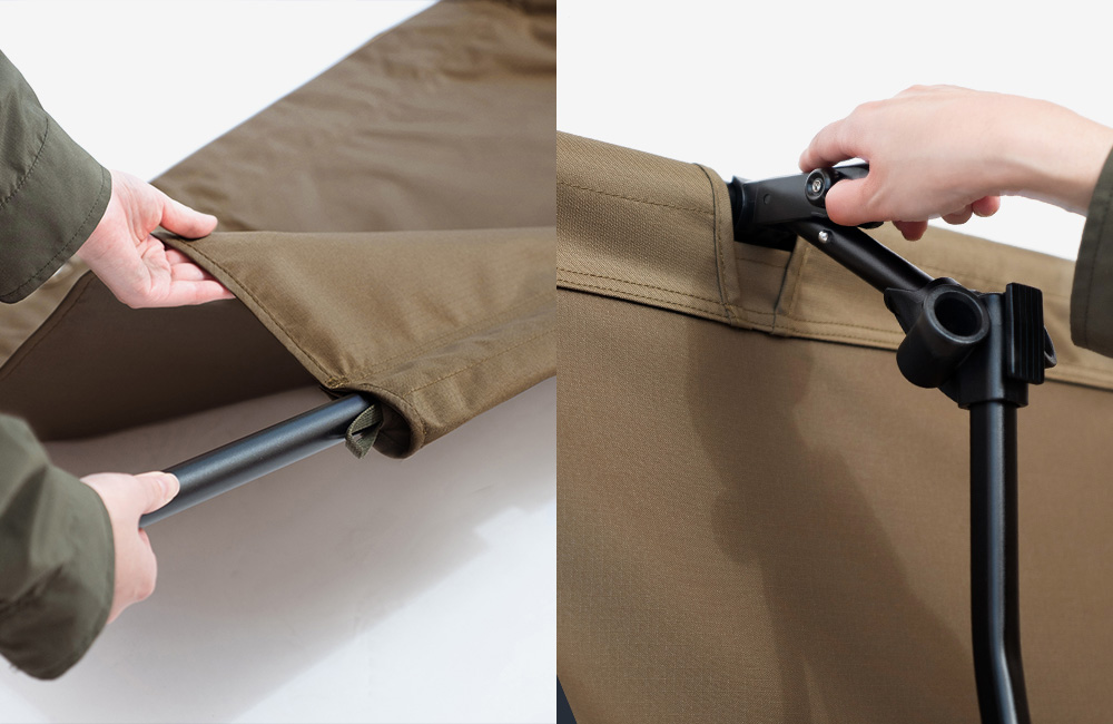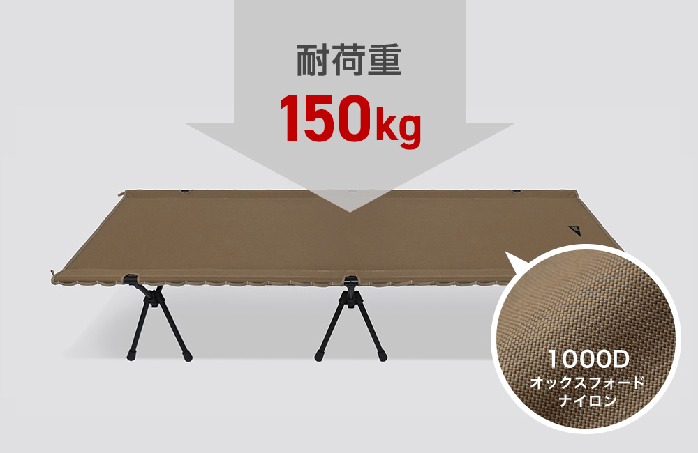 軽さと耐久性、そして寝心地を追求してたどり着いた1000D(デニール※数値が大きいほど高強度)オックスフォードナイロンと、航空機にも採用されるA7075超々ジュラルミンにより、150kgを超える耐荷重を実現。※数値は分散耐荷重になります。