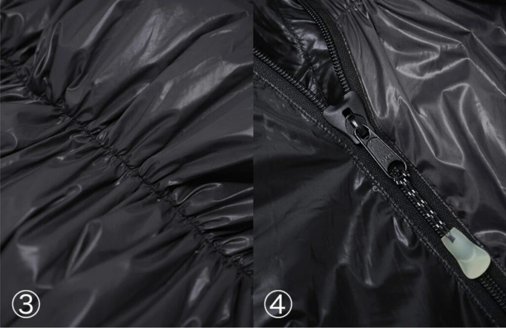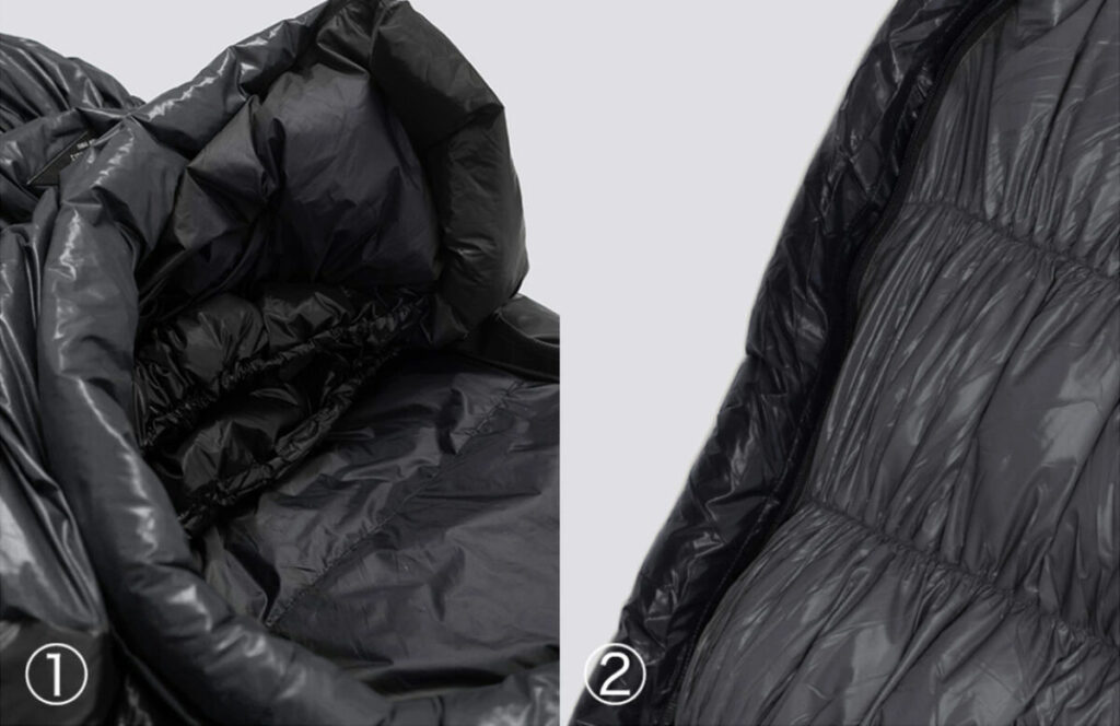 1、2.冷気の侵入を防ぐ首回りとジッパー内側のドラフトチューブ