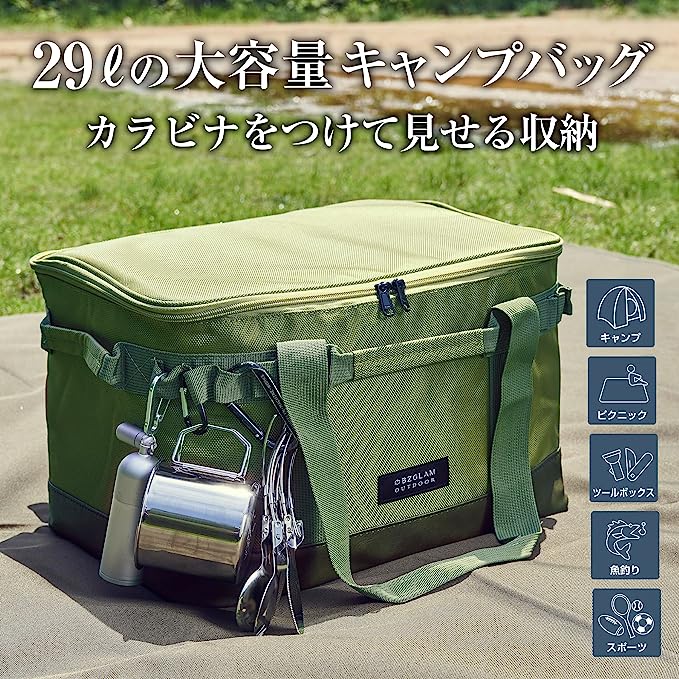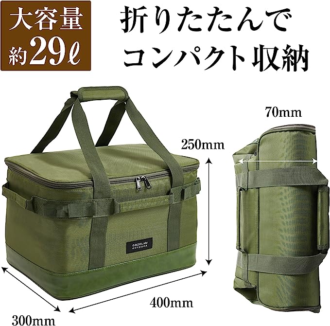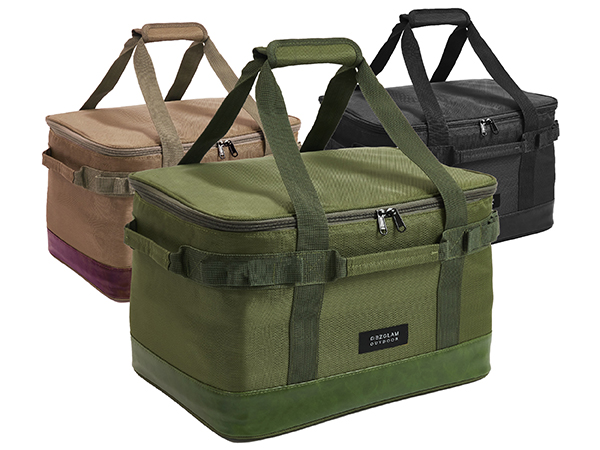 同製品は、大容量で取り外し可能な仕切り版が2枚装備されたアウトドアバッグとなる。耐荷重30kgの丈夫なつくりに、使わないときはコンパクトに折りたためるのも特徴だ。カラーはカーキ・サンド・ブラックの3色展開である。かさばりやすいアイテムも同製品を活用して便利に持ち運んでみてはいかがだろうか。